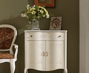 Тумбочка для обуви в прихожую Tarfa производится испанской мебельной фабрикой в белом цвете из массива бука, покрытого шпоном. Изящная модель на гнутых ножках украшена искусной резьбой. В верхней части сделан выдвижной ящик универсального предназначения, который может быть использован для хранения средств по уходу за обувью.