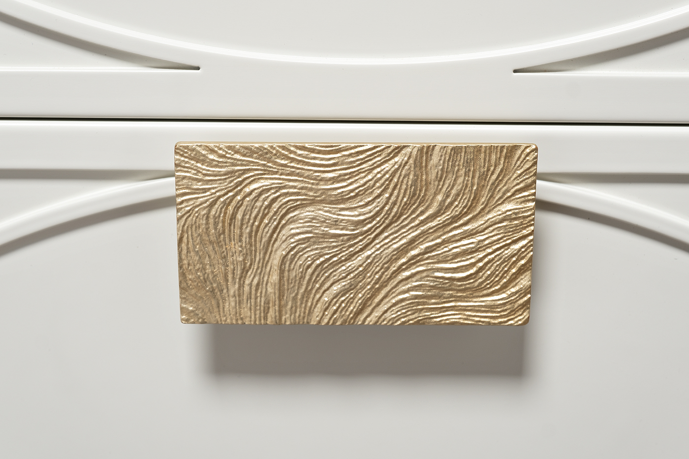 Бежевый матовый фасад украшен объемным дугообразным декором и широкими рельефными ручками золотого цвета (матовое золото).
