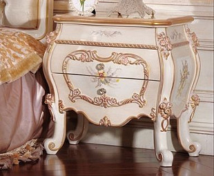 Тумбочка в спальню белая Лейла изготовлена из МДФ белоснежного оттенка. Декорирована росписью цветами и объемными узорами из ППУ с позолотой и цветочными мотивами.