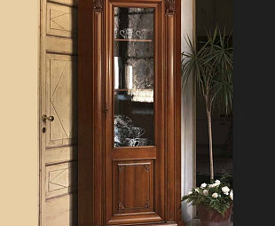 Угловая витрина из массива Vivaldi фабрики Saoncella. Витрина выполнена в классическом стиле, итальянскими мастерами и дизайнерами. Витрина сделана из высококачественного массива и шпона, в цвете вишня. Витрина имеет одну дверь.