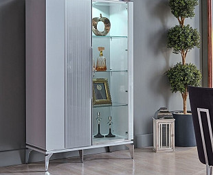 Двухдверная витрина Loretto для столовой имеет на дверях стеклянные накладки, красивый вертикальный рисунок, что добавляет изысканности ее дизайну. Хромированные ножки и ручки обеспечивают витрине утонченный и современный вид.
