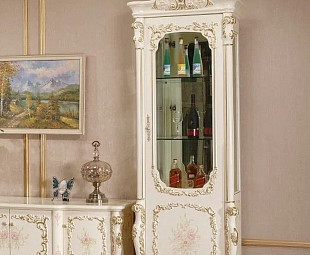 Изготовлена из МДФ белоснежного оттенка, фасады глянцевые, покрыты несколькими слоями лака, украшены декоративной росписью с позолотой и резьбой. Цветочные мотивы внизу и стеклянная распашная дверь с нишами внутри, сверху добавлен декор из ППУ с золочением.