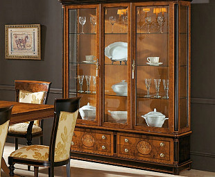 Шпон ясеня, самшита, ореха и палисандра, патина золото или серебро, лак.