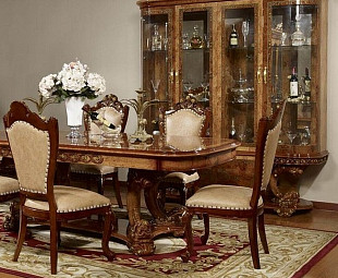 С четырьмя стеклянными дверцами, скрывающими полки для хранения предметов интерьера, изготовлена из МДФ орехового оттенка с глянцевыми фасадами, покрытыми росписью с позолотой. Верх и ножки основания украшены декоративными элементами из ППУ.