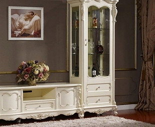Стеклянные двери, полки и боковые стороны модели позволяют выгодно продемонстрировать чайный и столовый сервизы, различные сопутствующие коллекции. Имеется два выдвижных ящика. Декоративные элементы представлены красивейшей резьбой с позолотой, карнизом-короной, венчающим фасад вверху, ручками, фигурными ножками и плавным нижним краем.