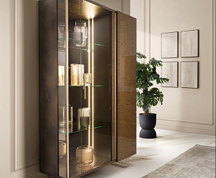 Витрина имеет два отделения - узкое с глухой глянцевой дверцей и широкое, отделанное внутри матовой бронзой, с изысканной боковой светодиодной подсветкой и дверью из бронзового стекла.