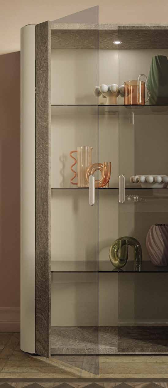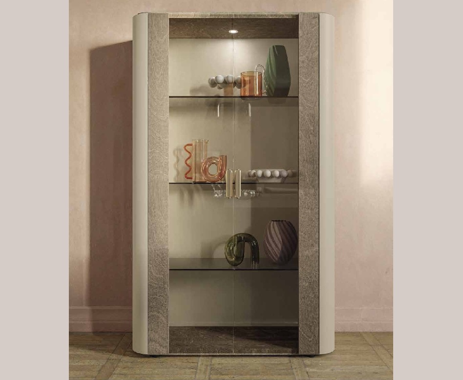 Стеклянный витринный шкаф, отличающийся матовой отделкой в теплых коричневых тонах и использованием двух разных материалов. Гармонично сочетает современный дизайн с изысканной роскошью и элегантными изогнутыми линиями. Витрина вполне может послужить украшением любого интерьера.