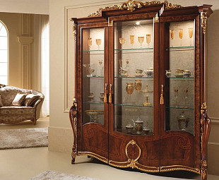 Витрина для столовой Donatello итальянской мебельной фабрики Arredo Classic изготовлена из массива дерева и относится к классическому интерьерному стилю. В этой модели можно со вкусом расположить чайную и столовую посуду или обустроить сувенирные композиции. Стеклянные распашные двери и полочки не создают препятствий для обозрения коллекций, находящихся внутри. Изюминку придают верхняя часть фасада разной высоты, украшенная короной-карнизом сусального золочения, фигурный нижний край, обрамленный резным узором, декоративные накладки искусной работы, красивый рисунок на поверхности. Такая мебель будет эффектно смотреться в просторной гостиной комнате в комплекте с мягким диваном и креслами.