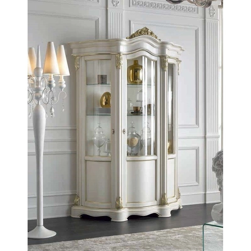 Витрина в классическом стиле. Он имеет три распашные стеклянные дверцы. Внутри находятся стеклянные полки. Резные детали подчеркивают оригинальность этой модели.