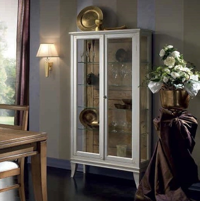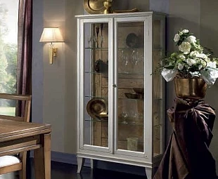 Шкаф в классическом стиле. Он имеет две распашные стеклянные дверцы. Внутри находятся стеклянные полки. Простая форма и плавные линии подчеркивают оригинальность этой модели.