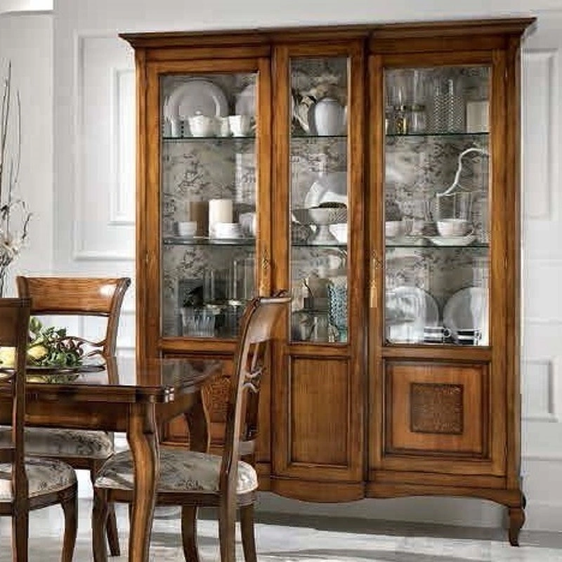 Витрина в классическом стиле с изогнутыми ножками. Две распашные стеклянные дверцы с рельефной лицевой стороной. Стеклянные полки внутри.
