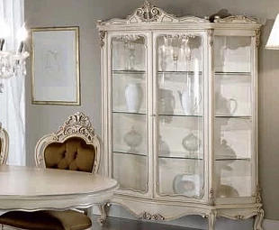 Витрина в классическом стиле с изогнутыми ножками. Имеет две распашные стеклянные дверцы. Внутри находятся стеклянные полки. Резные детали подчеркивают оригинальность этой модели.