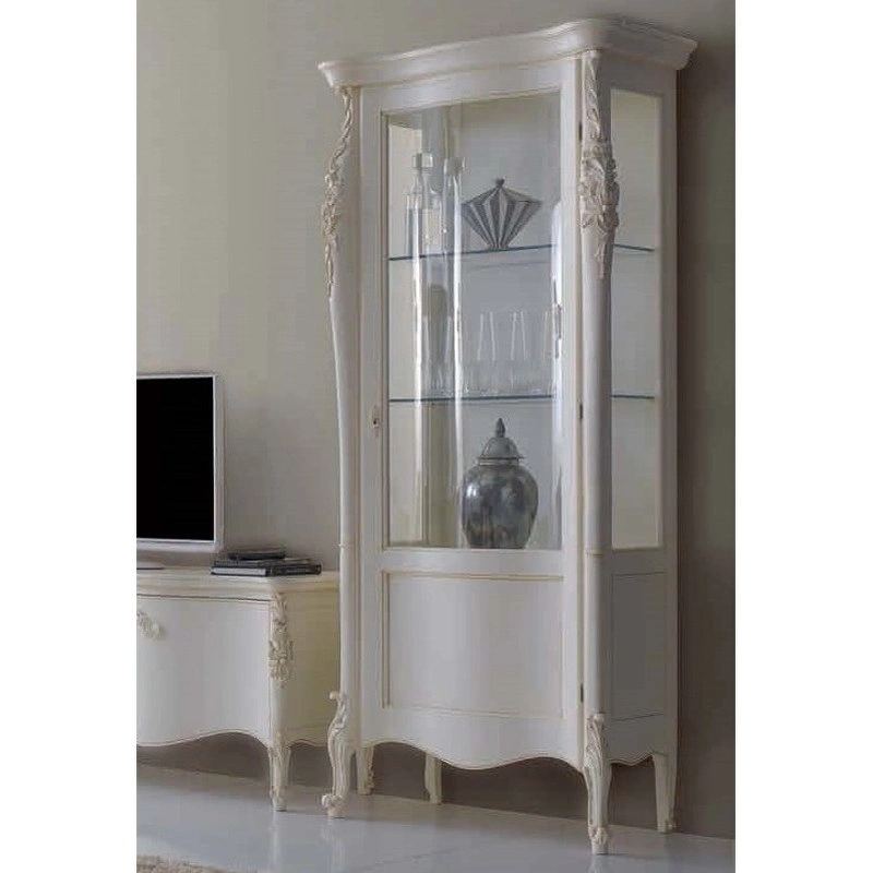 Витрина в классическом стиле с изогнутыми ножками. Распашная стеклянная дверца (открывается вправо). Внутри расположены стеклянные полки. Резные детали подчеркивают оригинальность этой модели.
