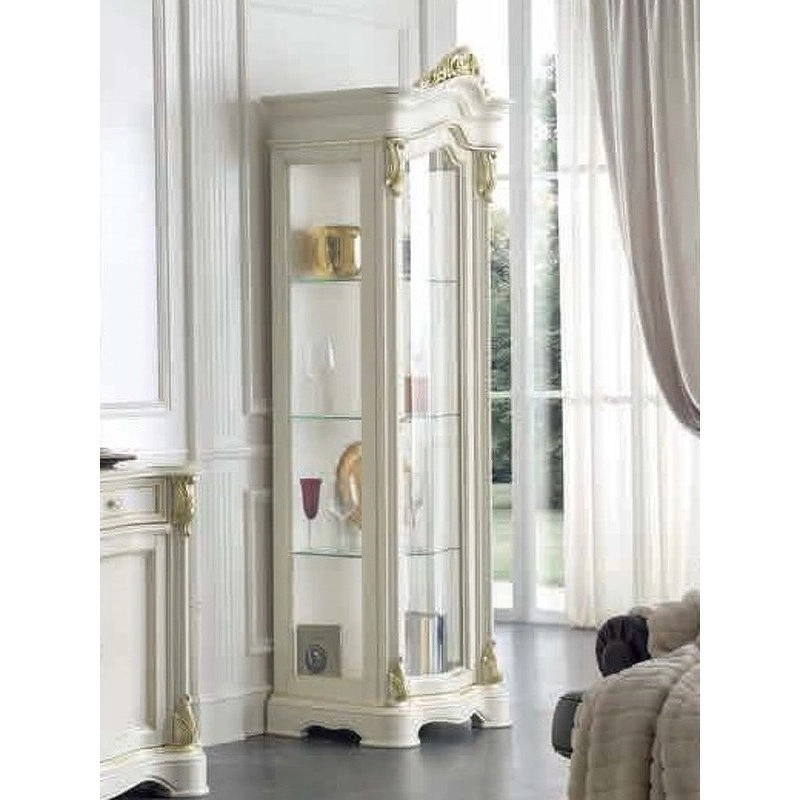 Шкаф в классическом стиле. Имеет распашные стеклянные дверцы (открываются вправо). Внутри имеются стеклянные полки. Резные детали подчеркивают оригинальность этой модели.