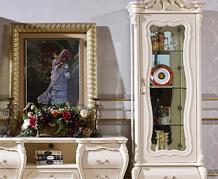 Витрина в гостиную для посуды Белая Мишель однодверная дополнит интерьер в классическом стиле.