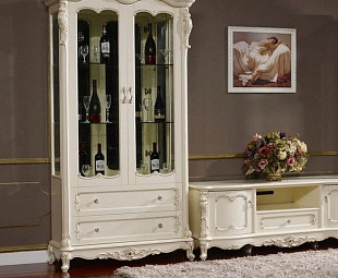 Витрина в гостиную двухдверная Габриэла – классическая модель с элементами барокко, представленная в молочном цвете с золотистым патинированием на резных художественных деталях. Две двери, полочки и боковые стороны, выполненные из стекла, придают воздушности и легкости пространству и позволяют по достоинству оценить сервизы и прочие аксессуары, расположенные внутри. Качественный МДФ, из которого изготовлен этот предмет мебели, предполагает длительный срок комфортной эксплуатации.