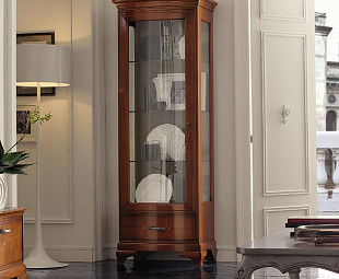 Однодверная витрина вишневого оттенка – классически лаконичный представитель коллекции Riva. Выполненная из массива черешни, модель имеет гладкий на ощупь и визуально, почти атласный фасад, с прямым рисунком древесных волокон. Геометрически правильный силуэт смягчен слегка плавными линиями, округлыми формами и фигурными ножками. Дверца, украшенная декоративными никелированными ручками, полочки и боковые стороны – стеклянные.
