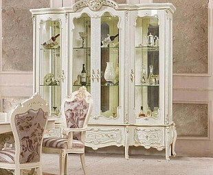 Большая и вместительная с четырьмя отделениями для предметов интерьера и посуды, прозрачные дверцы украшены золотым орнаментом по периметру. Изготовлена из МДФ, белоснежного оттенка с объемными элементами из ППУ и позолотой. Основание поддерживается изящно изогнутыми ножками с декором.