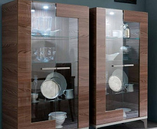 Витрина в гостиную стеклянная Serena - это элегантное дополнение общего дизайна комнаты в стиле модерн. Две распашных дверцы с оригинальным геометрическим рисунком скрывают вместительные полки для хранения посуды и предметов интерьера. Отделка шпоном дерева Кото в цвете "Вяз ваниль глянцевый" подчеркивается основанием с ножками из окрашенного металла.