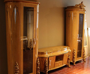 В наличии правосторонняя и левосторонняя модель. Изготовлена из МДФ в цвете "Орех". Распашная прозрачная дверца скрывает полки под посуду и предметы интерьера. Фасады глянцевые, покрыты росписью и задекорированы элементами из ППУ с позолотой.