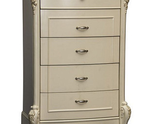Комод Катрин. Высокий комод выполнен в классическом стиле и украшен ручной лепкой. Комод имеет пять выдвижных ящика для хранения. Комод сделан из МДФ в матовом покрытии и в отделке молочно-белого цвета. Роскошный комод дополнит интерьер вашего дома.
