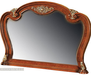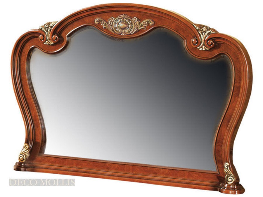 Большое зеркало из коллекции Carmen. Классическое зеркало в столовую для комода или туалетного столика. Зеркало для столовой имеет не ровные черты рамы, рама сделана из массива березы, в отделке из натурального шпона корня оливы, с инкрустацией цвета темный орех. Элегантное зеркало дополнит интерьер вашего дома. Зеркало украшено позолоченными элементами.