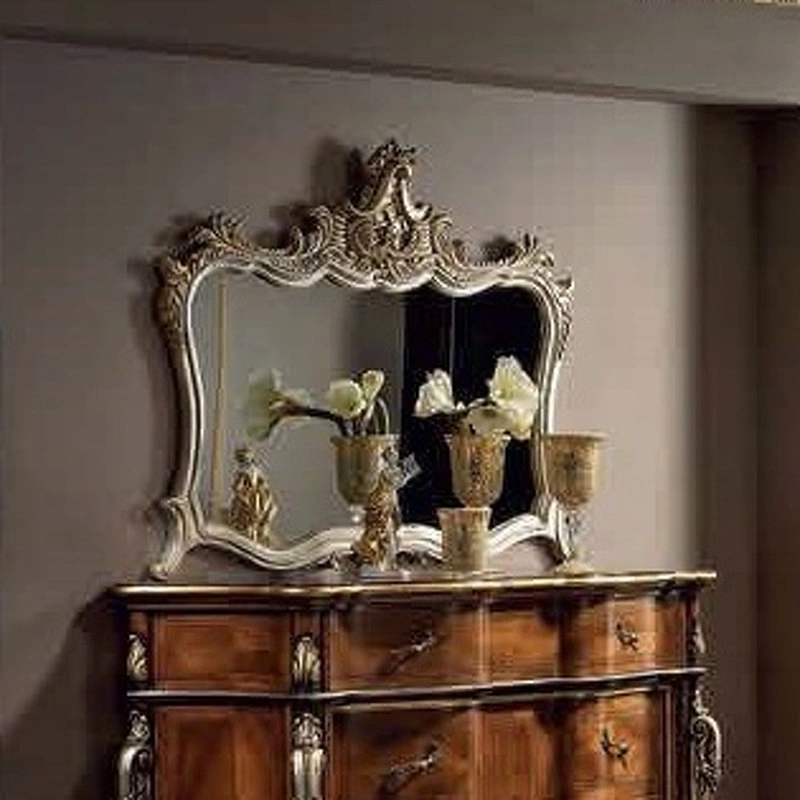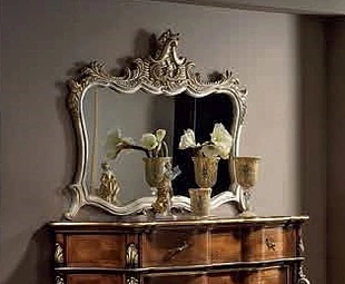 Зеркало прямоугольной формы, обрамленное изысканной резьбой, станет прекрасным дополнением для интерьера в классическом стиле.