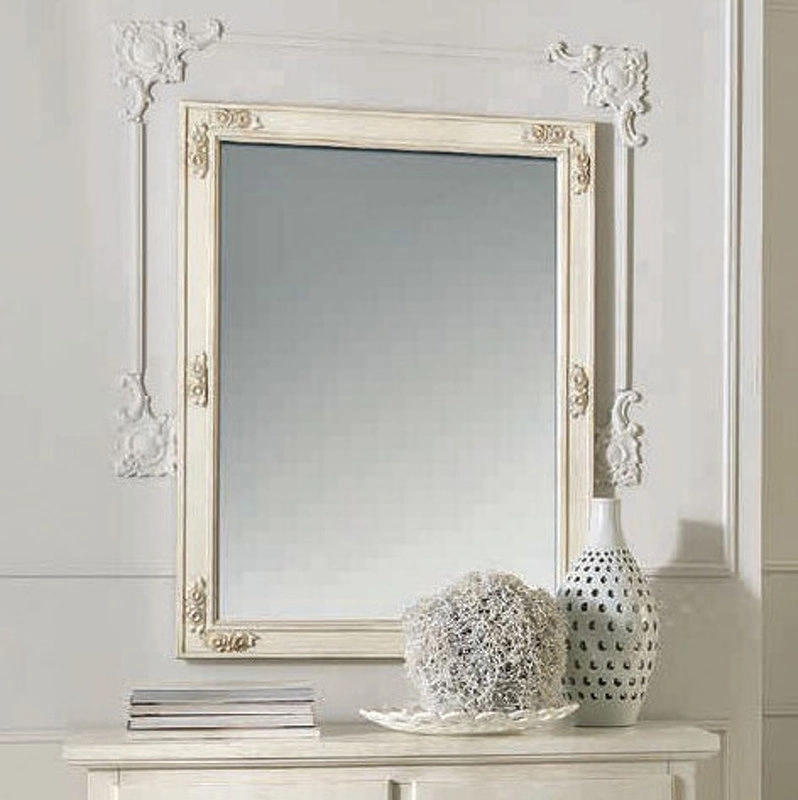 Прямоугольное зеркало в раме с резными элементами дополняет классический интерьер.