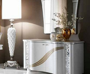 Зеркало к буфету Miro итальянской фирмы Arredo Classic представлено в классическом стиле. Элегантная и изящная модель имеет плавную трапециевидную форму со скругленными углами, волнообразный верхний край, украшенный декоративной серебристой вставкой. Прекрасно сочетается с комодом для посуды этой коллекции.