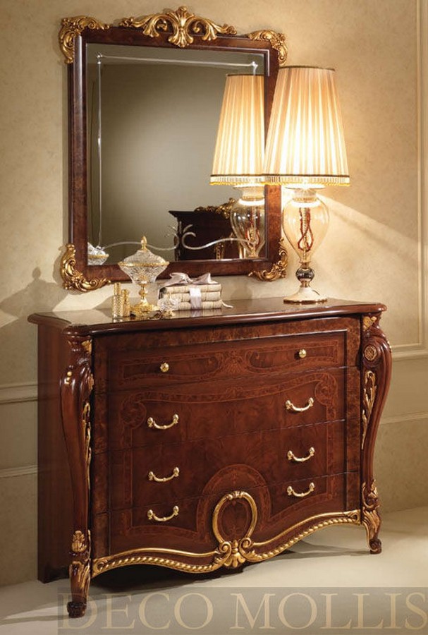 Зеркало к комоду в спальню Donatello от итальянской фирмы Arredo Classic выполнено в классическом стиле и является необходимым и красивым дополнением к туалетному столику из этой же коллекции. Строгая геометрическая форма модели по контуру украшена ненавязчивым тонким рисунком и резными декоративными накладками с сусальной позолотой. Для производства рамы используется массив натурального дерева.
