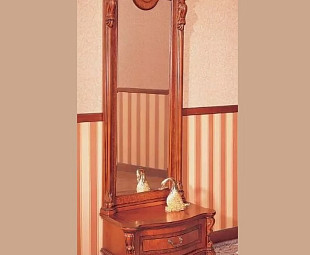 Зеркало напольное Angelina от торговой марки Carvelli. Классическое напольное зеркало располагается на миниатюрной тумбочке с выдвижным ящиком для хранения. Зеркало во весь рост выполнено из массива березы в цвете орех.