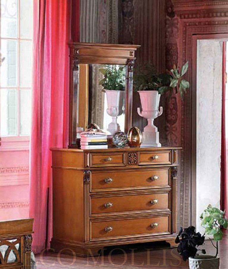 Зеркало с прямым карнизом Puccini фабрики Claudio Saoncella. Зеркало выполнено в классическом стиле, итальянскими мастерами и дизайнерами. Зеркало сделано из высококачественного массива и шпона, в цвете вишня с добавлением резьбы по дереву.