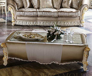 Журнальный прямоугольный столик с обивкой из ткани, и со стекляной столешницей Madame Royale выполнен в классическом стиле с помощью консультаций лучших итальянских архитекторов. Столик выполнен в окрасе под губку в бежевом цвете и специальной отделке под золото. Строгий, но приятный дизайн в классическом стиле, где присутствует утончённость вкуса, который отличает эту мебель и придаёт ей элегантность. Столик сделан из высококачественного массива дерева и украшена золотой фольгой, так же украшает столик продуманная с особым вниманием изящная резьба по дереву ручной работы. Итальянский столик Madame Royale наполнит ваш дом изысканностью, роскошью и уютом.
