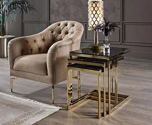 Набор из 3 журнальных столиков Montego различных размеров дополнит ваш дом элегантным и практичным образом. Золотистые металлические ножки в сочетании с чёрной столешницей под мрамором создают оригинальный вид.
