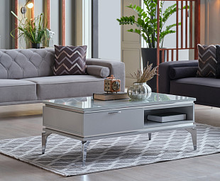 Журнальный столик с ящиком станет практичным местом для хранения небольших вещей, а его стеклянная столешница с рисунком и хромированные ножки и ручки украсят вашу гостиную.