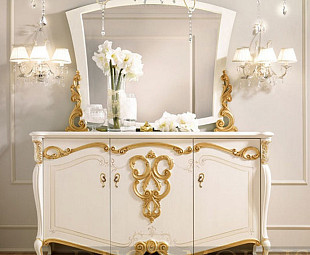 Золотое зеркало Viola. Классическое итальянское зеркало воплощает в себе необычайную красоту и роскошь, элегантность и изысканность. Рама зеркала украшена стразами Swarovsky. Зеркало Viola выполнено в цвете бежевый с золотом. Сделано зеркало из массива и дополнен шпоном. Великолепное итальянское зеркало Viola дополнит интерьер самого роскошного дома.
